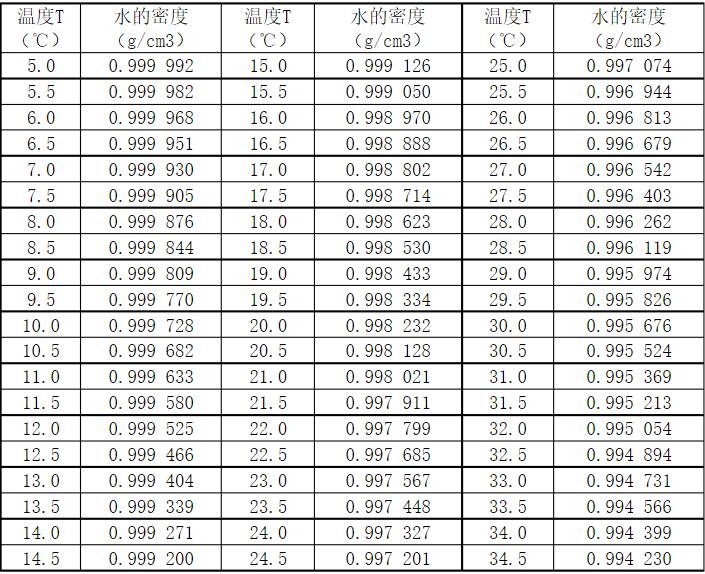水在不同温度下的密度比重
